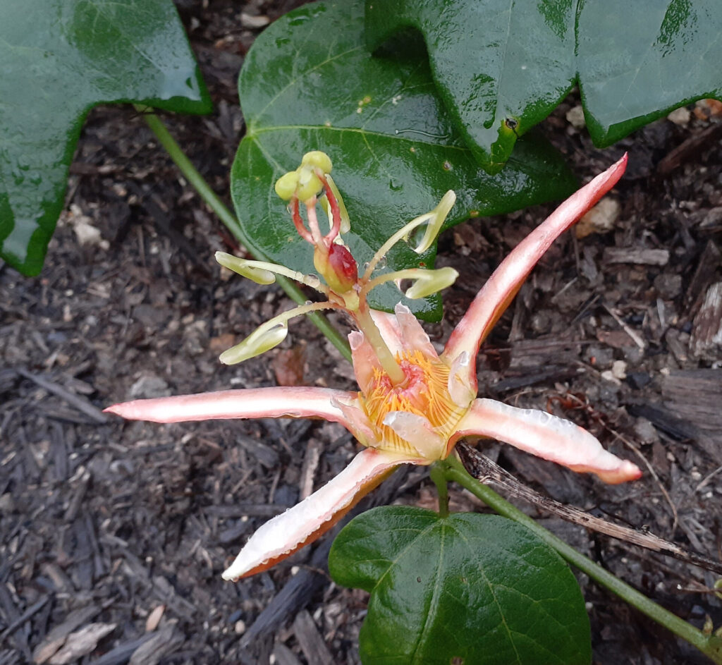 Passiflora….From Greek passio, passion. The name refers to the flower parts symbolically representing Christ’s passion. aurantia…From Latin, aurantius, orange coloured, referring to the flower.
