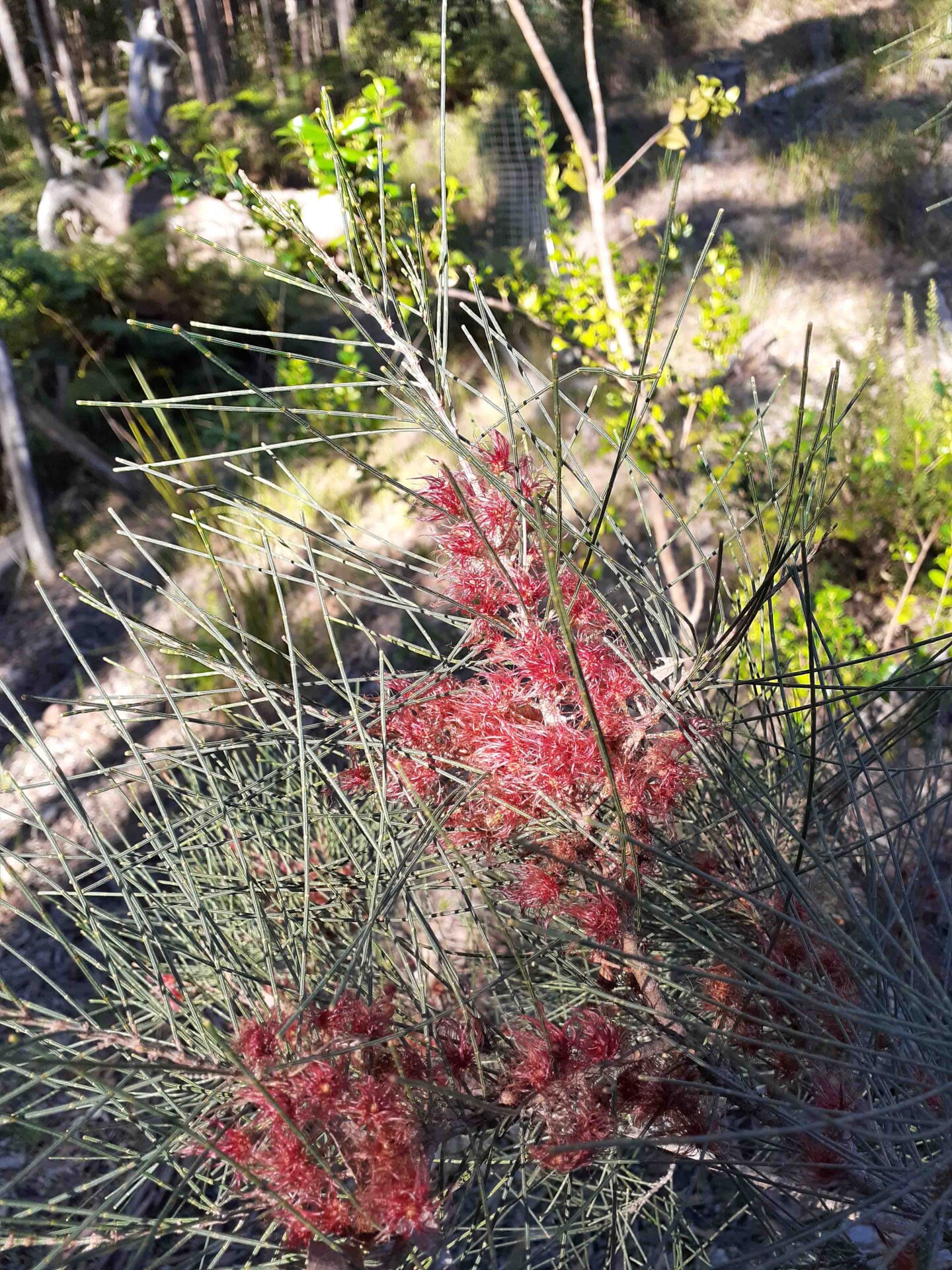 It is a spreading to erect, dioecious shrub. This sheoak forms a dense, low, closed heath when mass planted. The red flowers are very showy for an Allocasuarina.